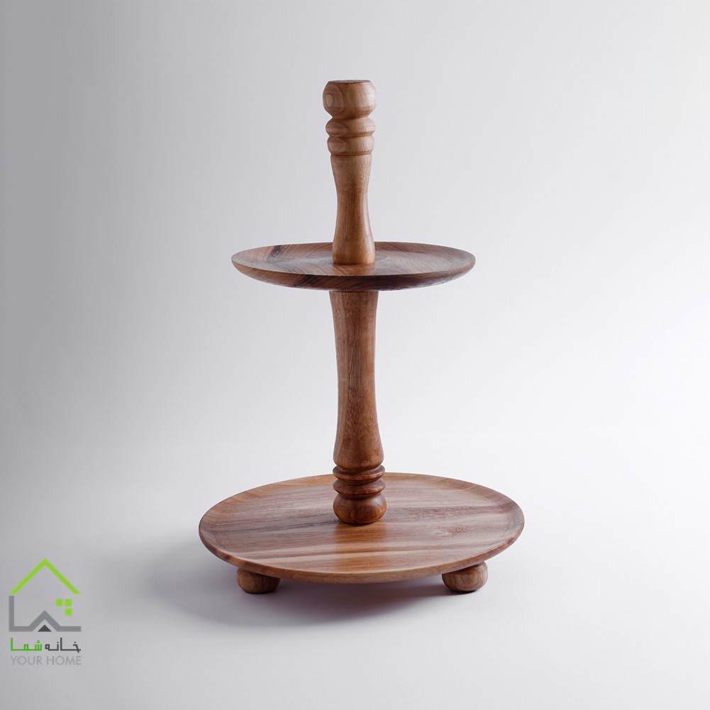 شیرینی خوری 2 طبقه چوبی گرد از دو صفحه چوبی در 2 سایز مختلف برای سرو شیرینی برای استفاده در روی میز پذیرایی می باشد.